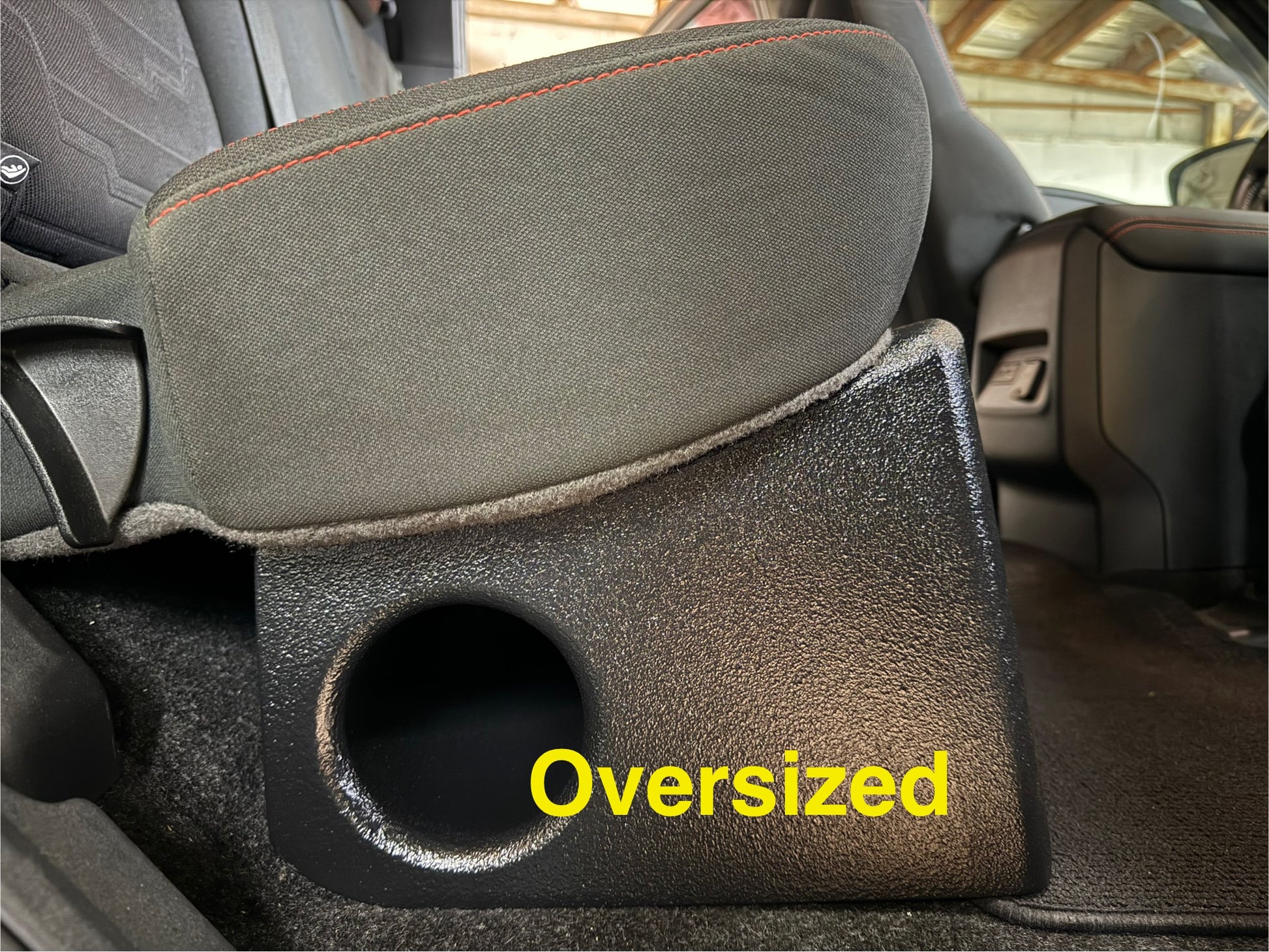 Perfect Fit (Seat Latches, No Seat Lift Required, Does Not Stick Out Past The Seat) 1.3 cubes of airspace that is tuned at 35hz (4 inch Aero Port) Subwoofer Max depth 5.8 inches, Max motor size 5.75 inches, Accepts 6.5 and 8 inch subs